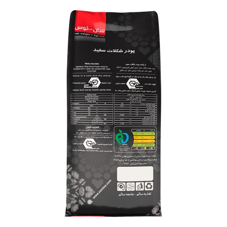 وایت چاکلت سانتوس از پودر پایه شکلات با طعم وانیل تهیه شده و در بستههای 1 کیلویی تولید میشود. با عطر و طعمی جذاب، میتوان آن را با آب یا شیر مخلوط کرده و همچنین به انواع نوشیدنیهای گرم افزود، تا یک تجربه خوشایند و دلچسب را ایجاد کنید.